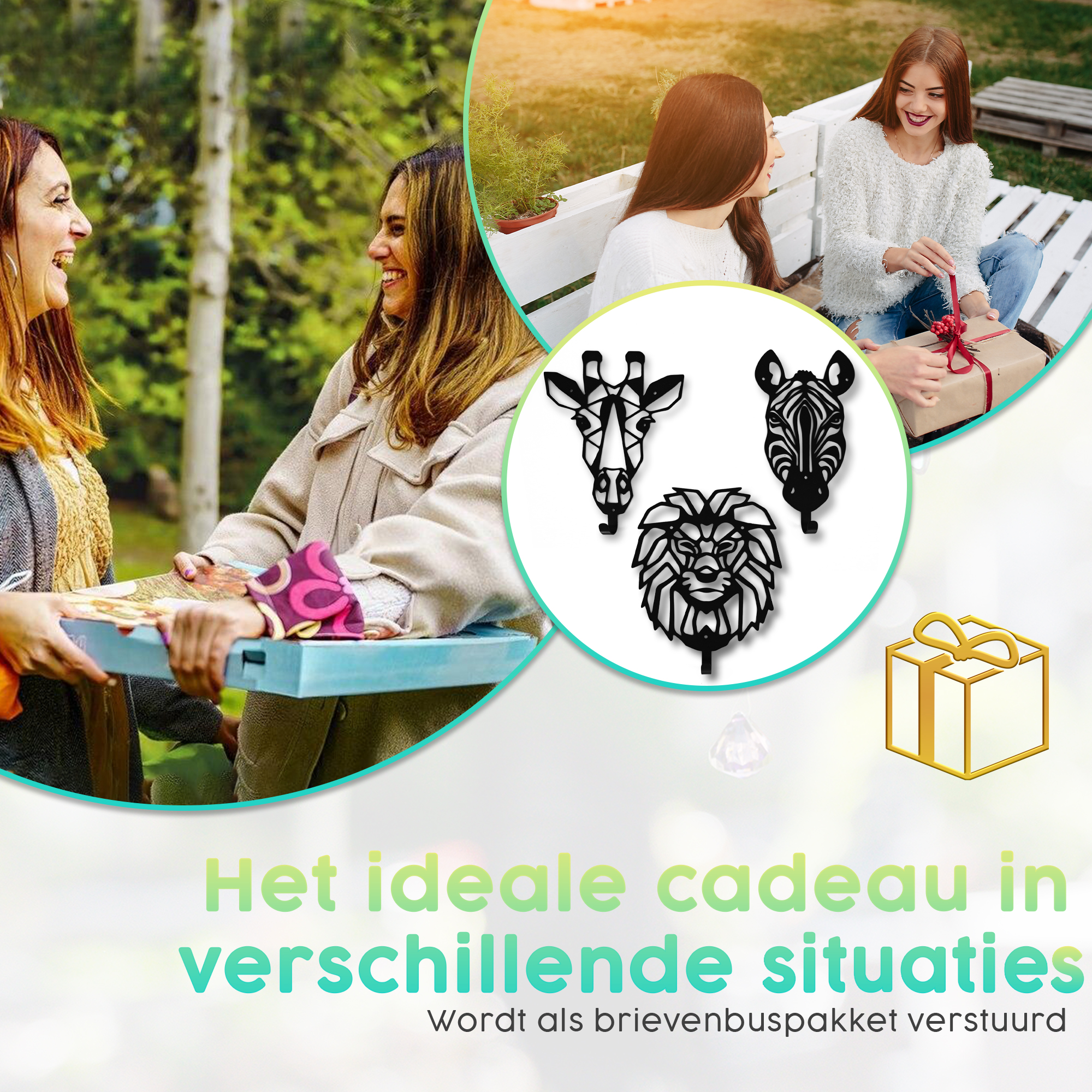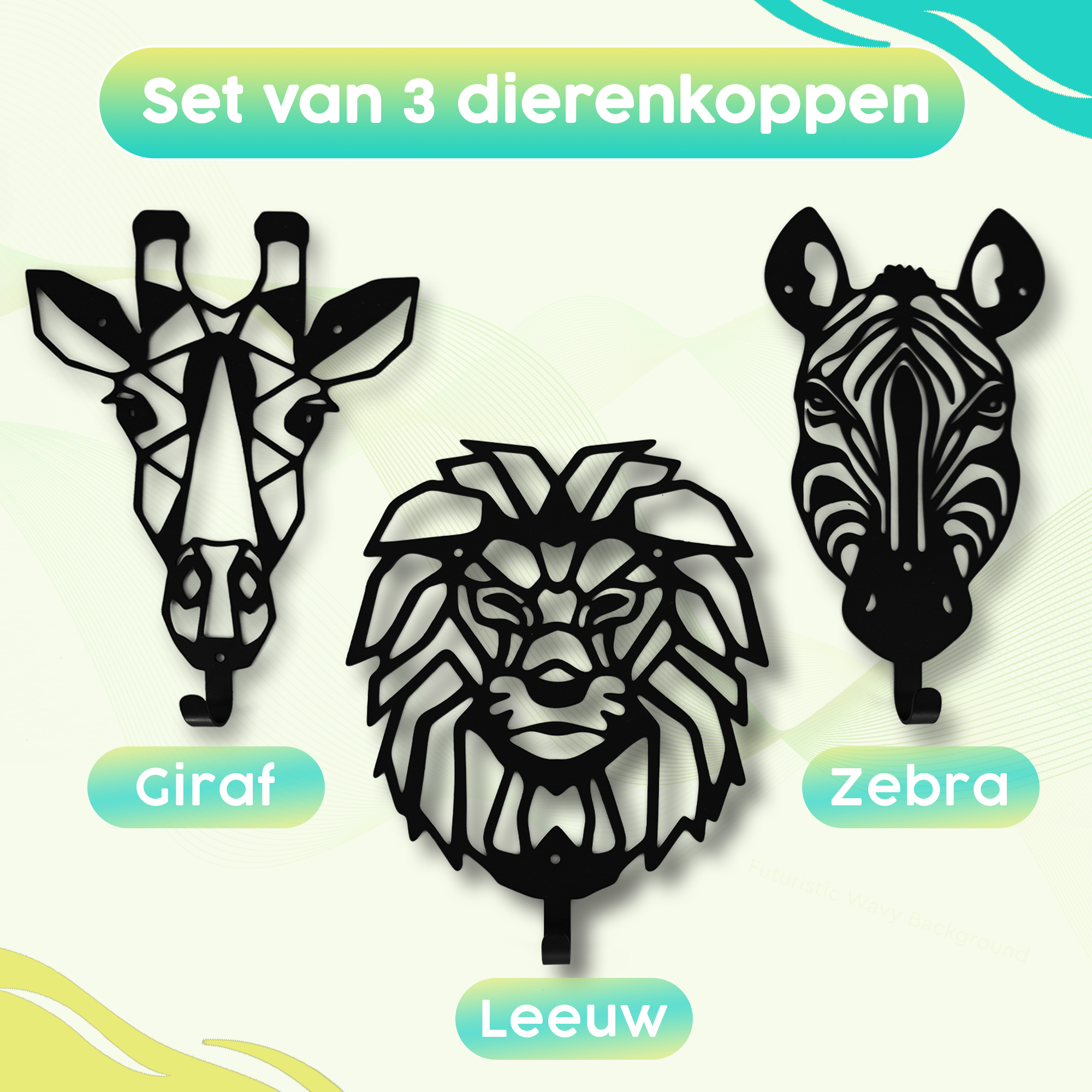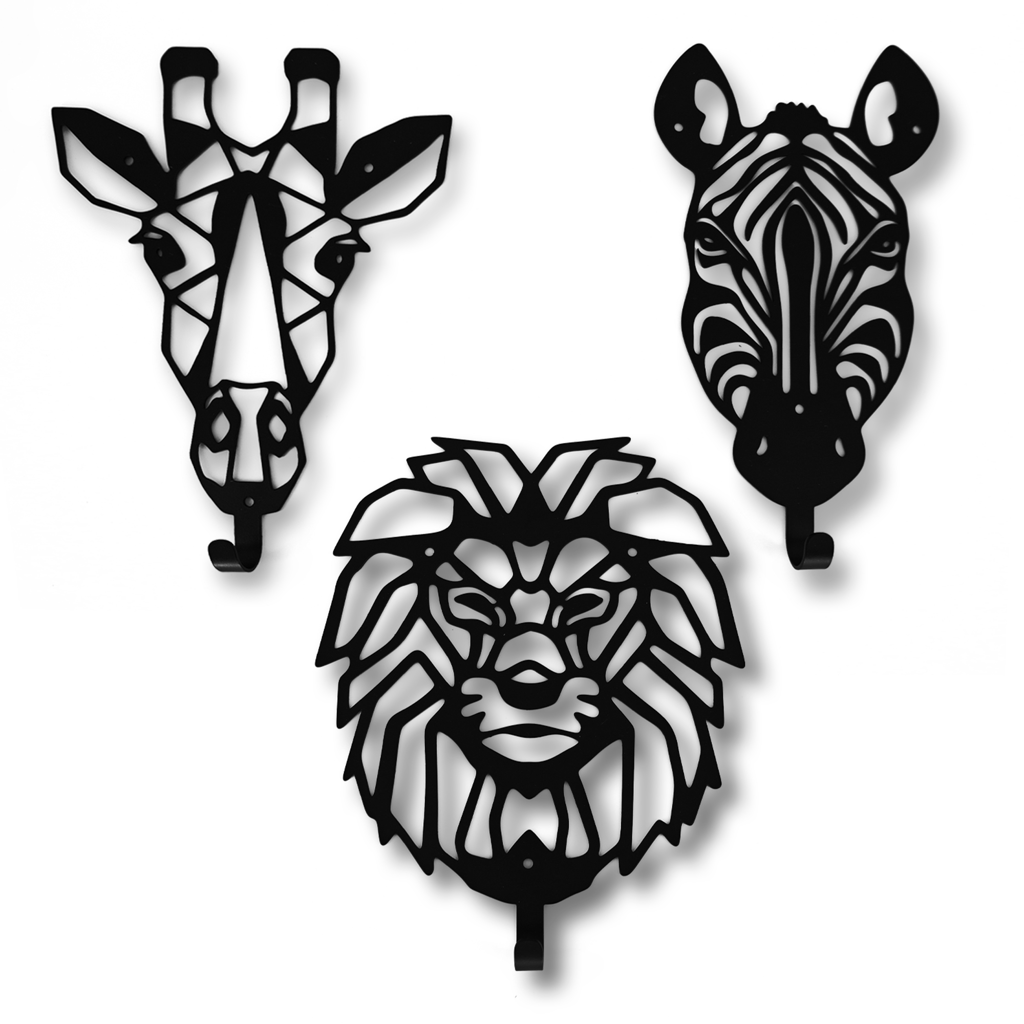 Jungle dierenkoppen kapstok van Muuzey. Set bestaat uit 3 stuks: Leeuw, Zebra & Giraf. Inclusief bevestigingsmateriaal.