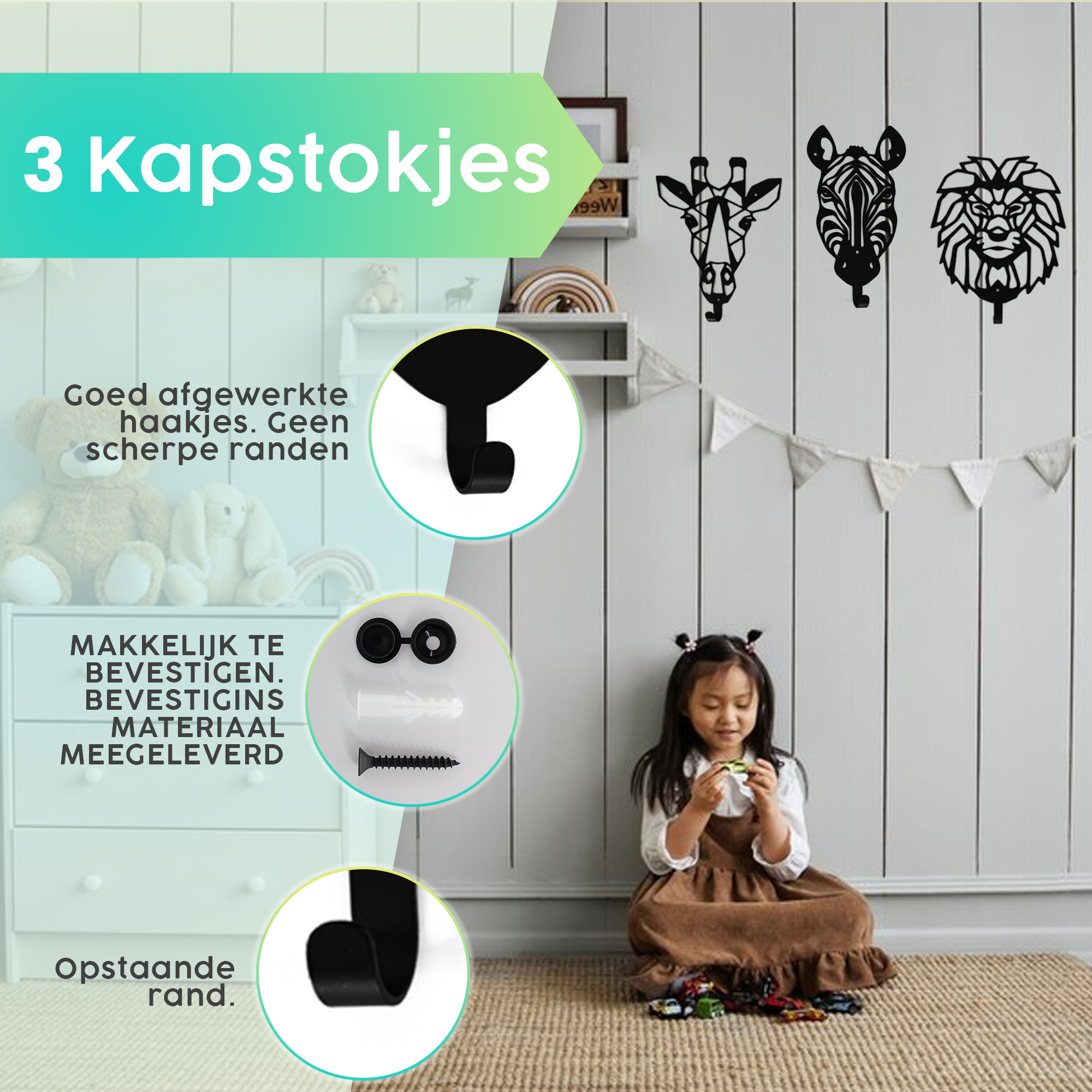 Let op!: Voor de veiligheid van kinderen raden wij je aan om de haakjes boven ooghoogte van de kinderen te plaatsen