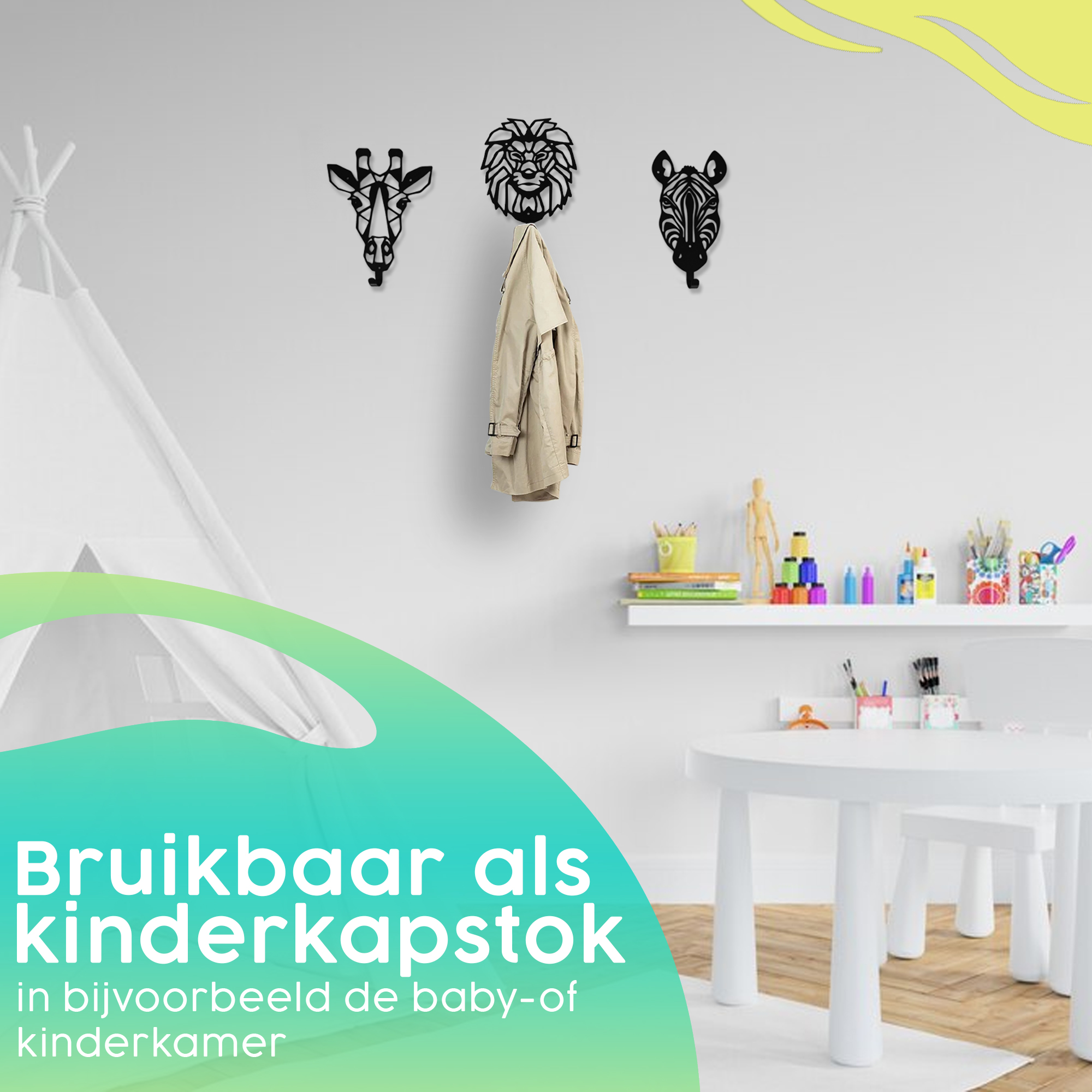 Elk dier heeft een eigen haakje en biedt voldoende ruimte voor alle jassen, kleding en tassen van je kinderen.