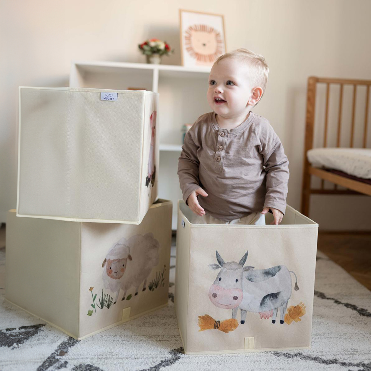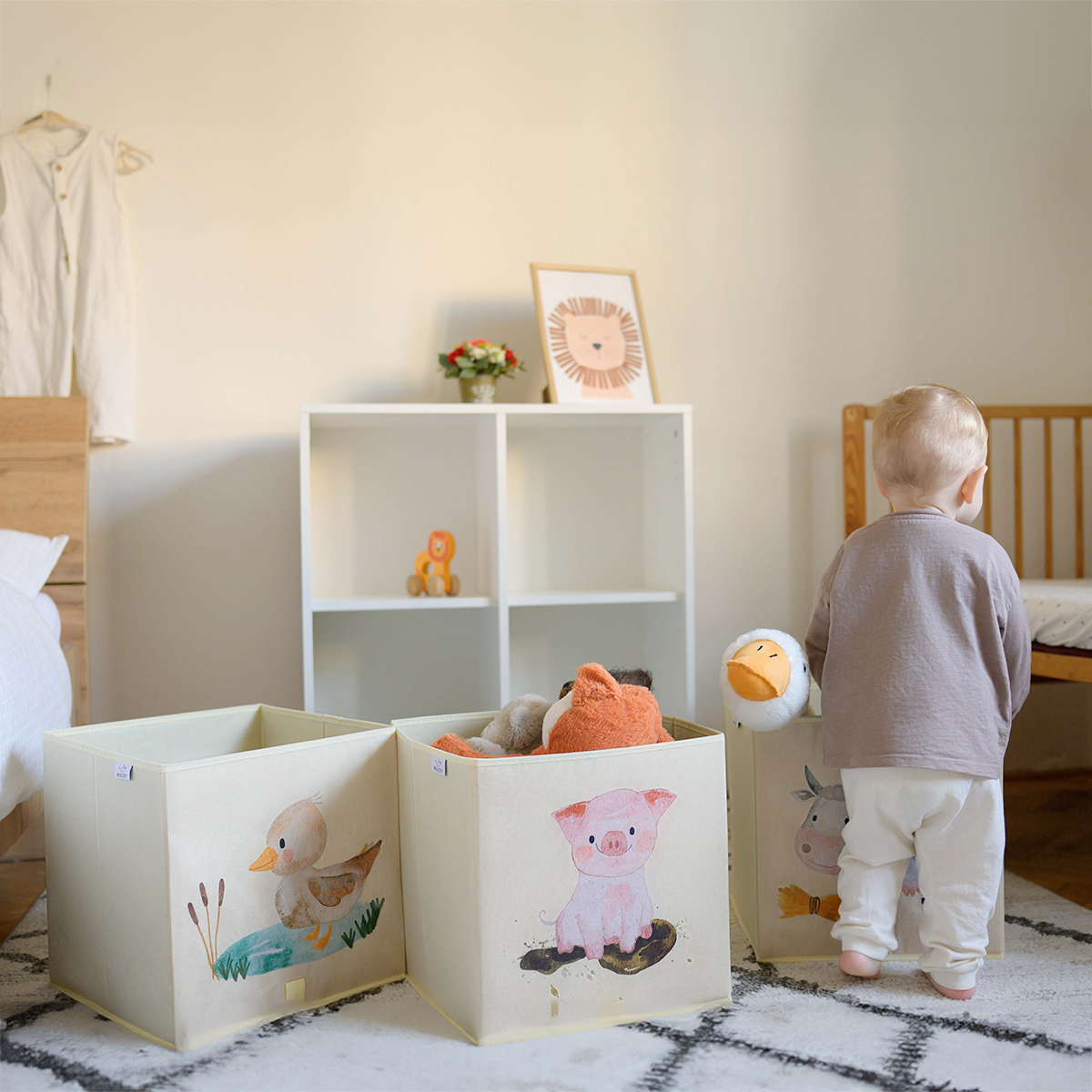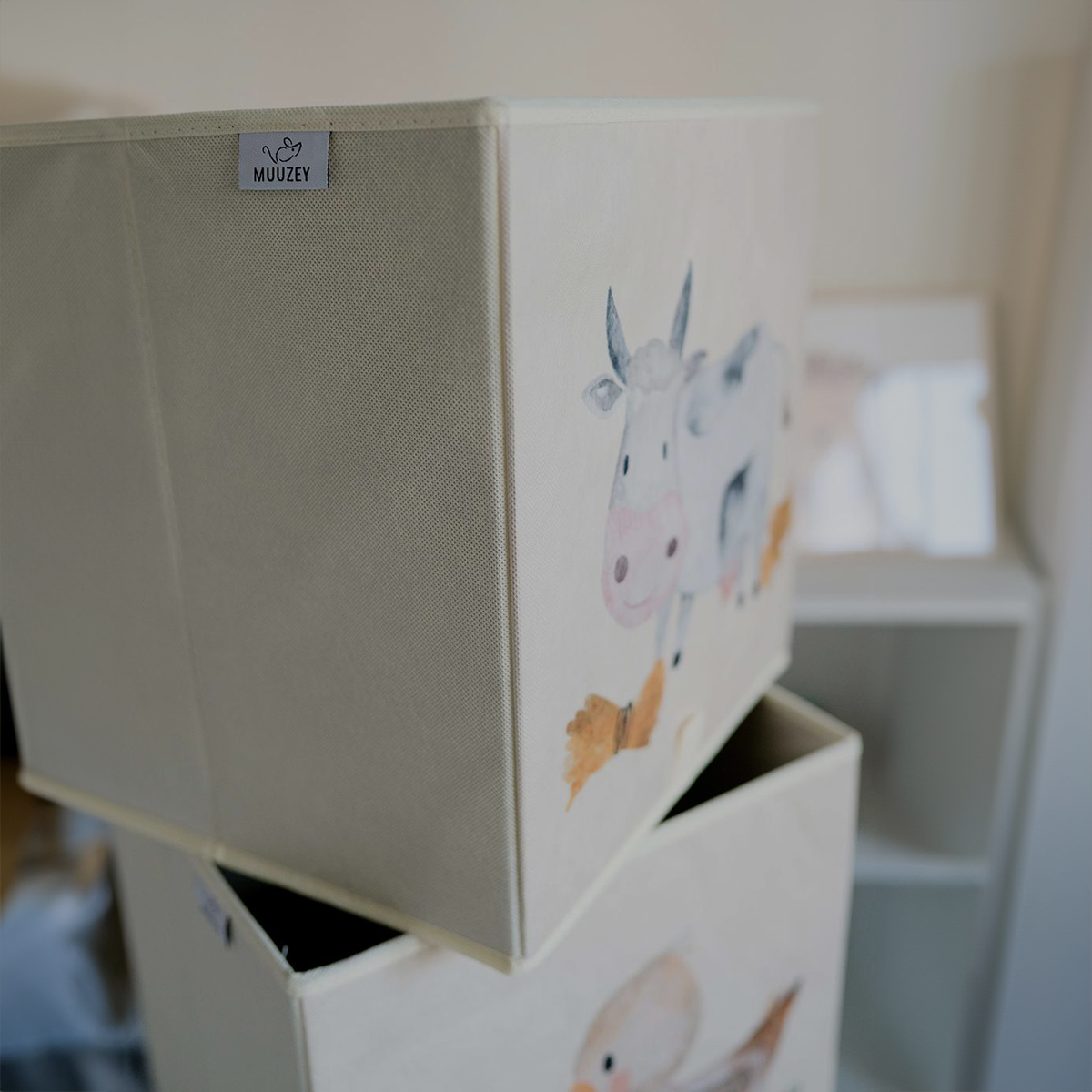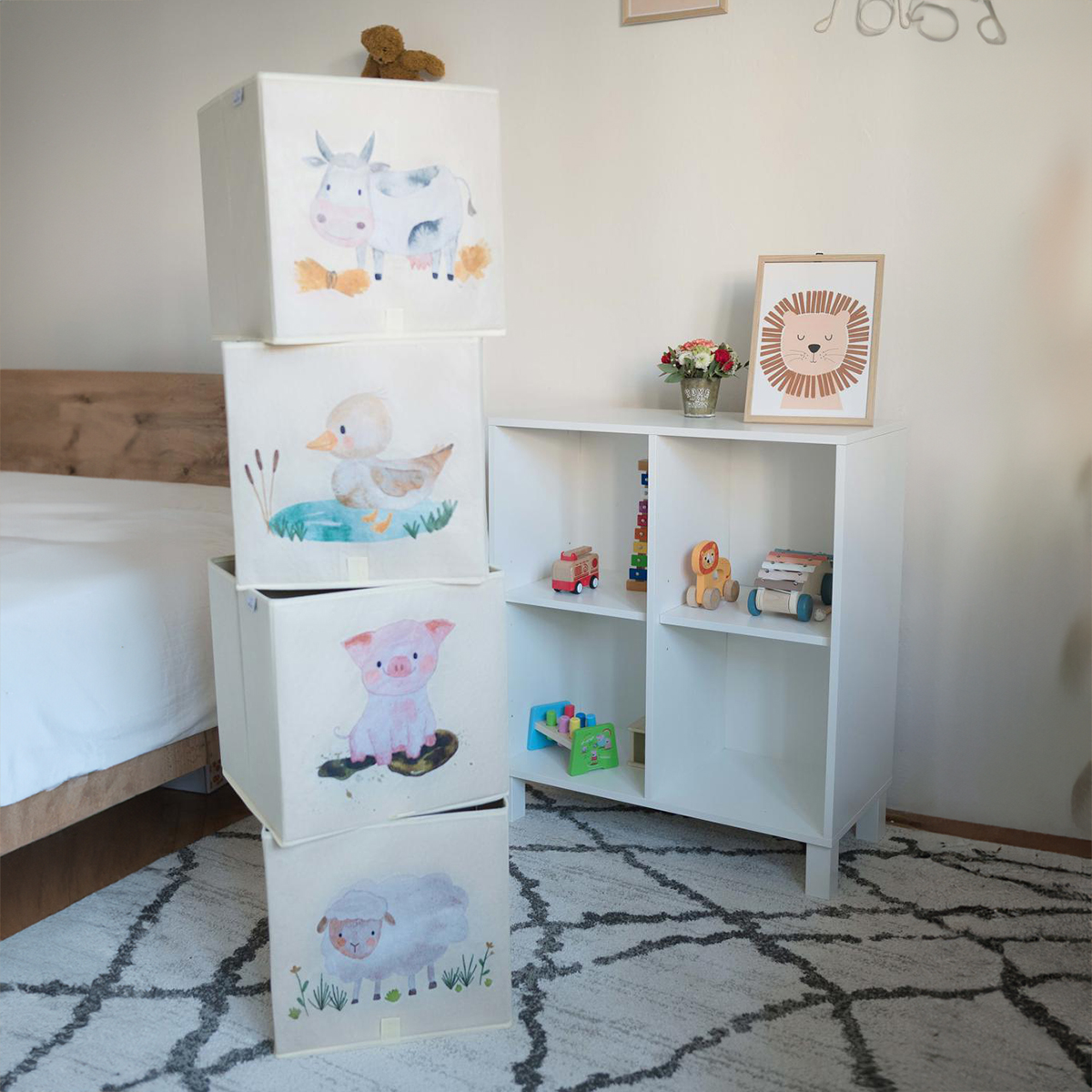 Elke kinderkamer opbergmand toont een ander schattig boerderijdier: koe, eend, varken en schaap. Dit maakt opruimen een leuke activiteit voor kinderen en stimuleert hen om zelf hun spullen netjes weg te zetten.